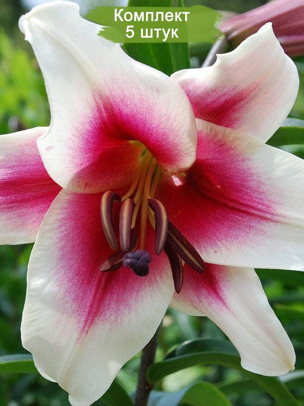 Лилия Garden Pleasure ОТ-гибрид (Садовое удовольствие) - это многолетнее травянистое растение с крупными, широкочашевидными цветками, полученное путем скрещивания Восточных и Трубчатых гибридов. Одним из главных преимуществ этого сорта является его сильный аромат. Растение достигает высоты до 150 см, а его цветки имеют белый окрас с ярко-розовым центром. Длинные тычинки покрыты красно-коричневой пыльцой.